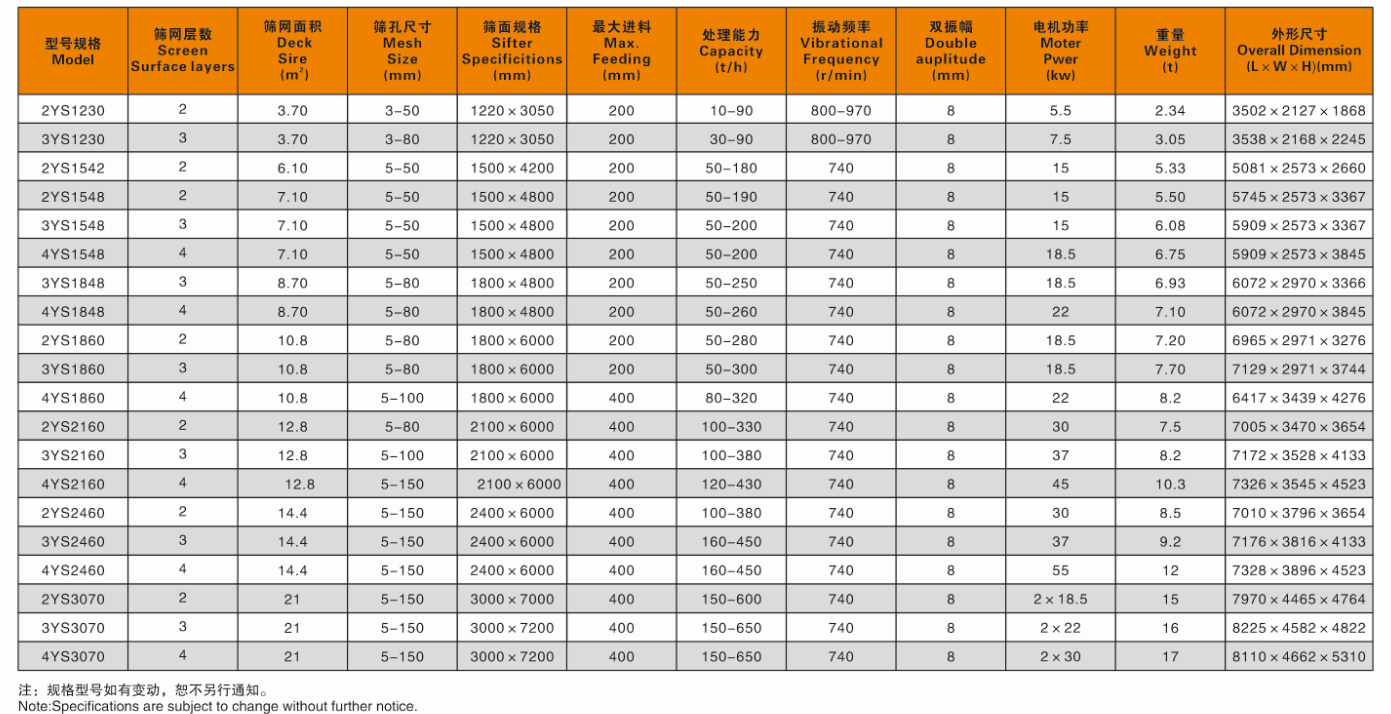 Ys series circular vibrating screen is the latest generation of screening equipment specially designed by our company for screening materials in quarries; This series has complete specifications, novel structure, strong exciting force, large processing capacity, high screening efficiency and low vibration noise; Brand new design and excellent manufacturing make this series of products firm and durable and easy to maintain; The design has been widely used in construction, transportation, energy, cement, mining, chemical and other industries.